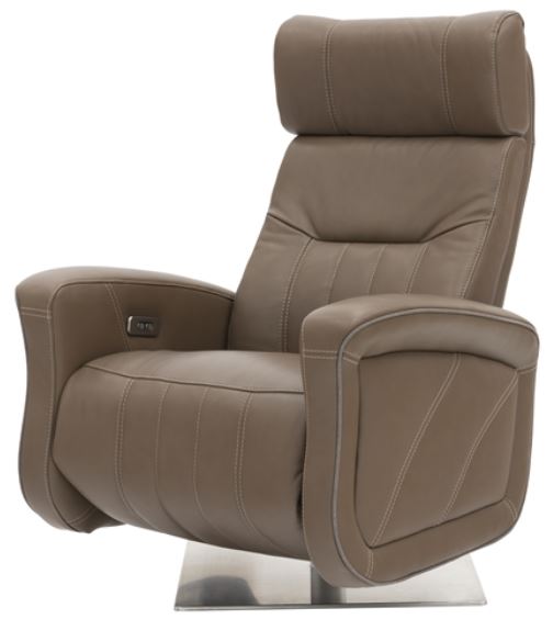 Power swivel recliner with power adjustable headrest made in Canada. Recliner features a harmonized dual electric functionality, an integrated cordless battery and gel memory foam seating for ultimate comfort. It comes with a stainless steel square base. Available in multiple options of fabrics and leathers, for an upcharge.Read More