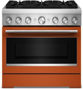 Expand your skills with a 36-inch KitchenAid® Commercial Style Range with 6 burners. This dual fuel range combines a gas cooktop with the even baking of an electric oven. Two 20,000 BTU Ultra Power™ Dual-Flame Burners offer the power and precision to successfully sear, simmer, stir-fry and sauté. Even-Heat™ True Convection gives consistent baking and roasting, plus air fry mode that yields crispy, golden results.Read More