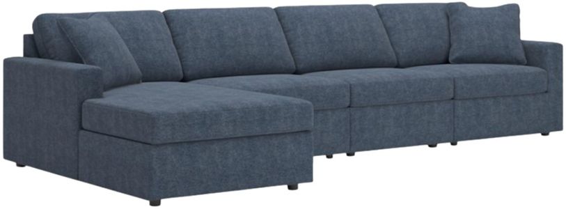 Comprend 4 éléments modulaires : méridienne d'angle avec accoudoir gauche, 2 fauteuils sans accoudoirs et fauteuil d'angle avec accoudoir droit.