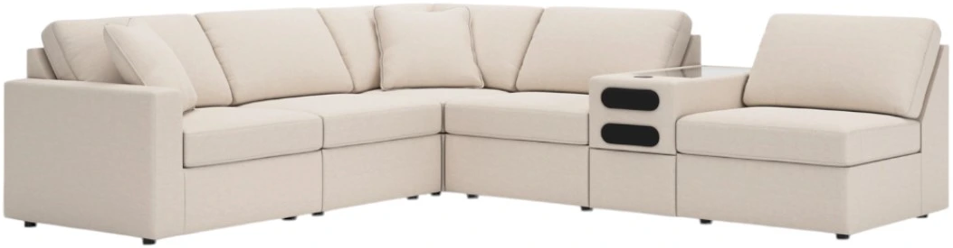 Comprend 6 éléments modulaires : fauteuil d'angle avec accoudoir gauche, console audio avec rangement, 3 fauteuils sans accoudoirs et coin.