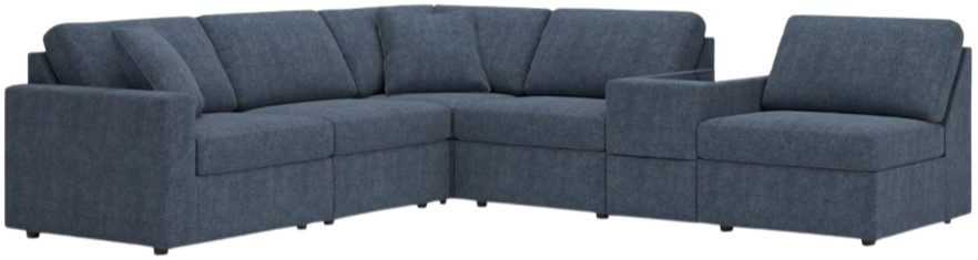 Comprend 6 éléments modulaires : fauteuil d'angle avec accoudoir gauche, 3 fauteuils sans accoudoirs, coin et console avec rangement.
