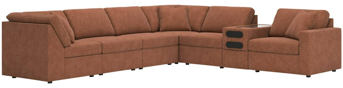 Comprend 7 éléments modulaires : fauteuil d'angle avec accoudoir à droite, console audio avec rangement, 2 coins et 3 fauteuils sans accoudoirs.