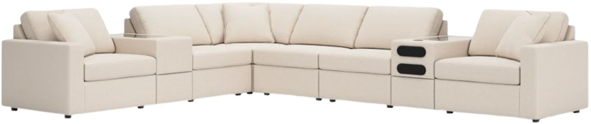 Comprend 8 éléments modulaires : fauteuil d'angle avec accoudoir gauche, console audio avec rangement, console avec rangement, 3 fauteuils sans accoudoirs, coin et fauteuil d'angle avec accoudoir droit.
