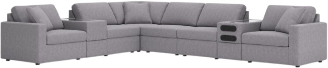 Comprend 8 éléments modulaires : fauteuil d'angle avec accoudoir gauche, console audio avec rangement, console avec rangement, 3 fauteuils sans accoudoirs, coin et fauteuil d'angle avec accoudoir droit.