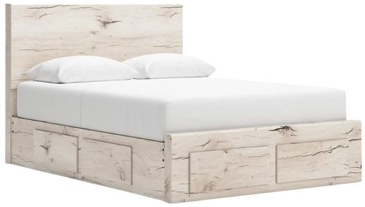 Comprend une tête de lit à panneaux, un pied de lit de rangement, 2 unités de rangement sous le lit et des lattes à roulettes.